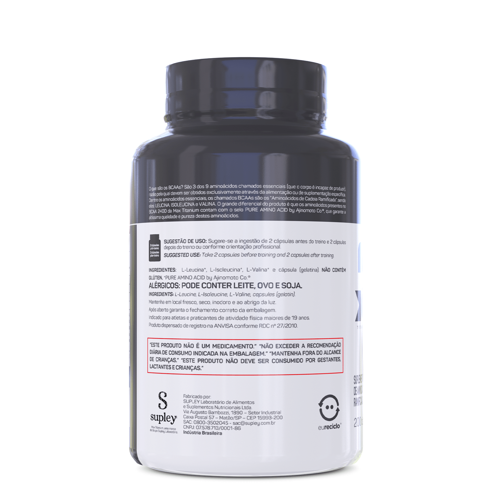O que são os BCAAs? São 3 dos 9 aminoácidos chamados essenciais (que o corpo é incapaz de produzir), razão pela qual devem ser obtidos exclusivamente através da alimentação ou de suplementação específica. Dentre os aminoácidos essenciais, os chamados BCAAs são os “Aminoácidos de Cadeia Ramificada”, sendo eles: LEUCINA, ISOLEUCINA e VALINA. O grande diferencial do produto é que os aminoácidos presentes no BCAA 2400 da Max Titanium contam com o selo PURE AMINO ACID by Ajinomoto Co.®, que garante a altíssima qualidade e pureza destes aminoácidos.