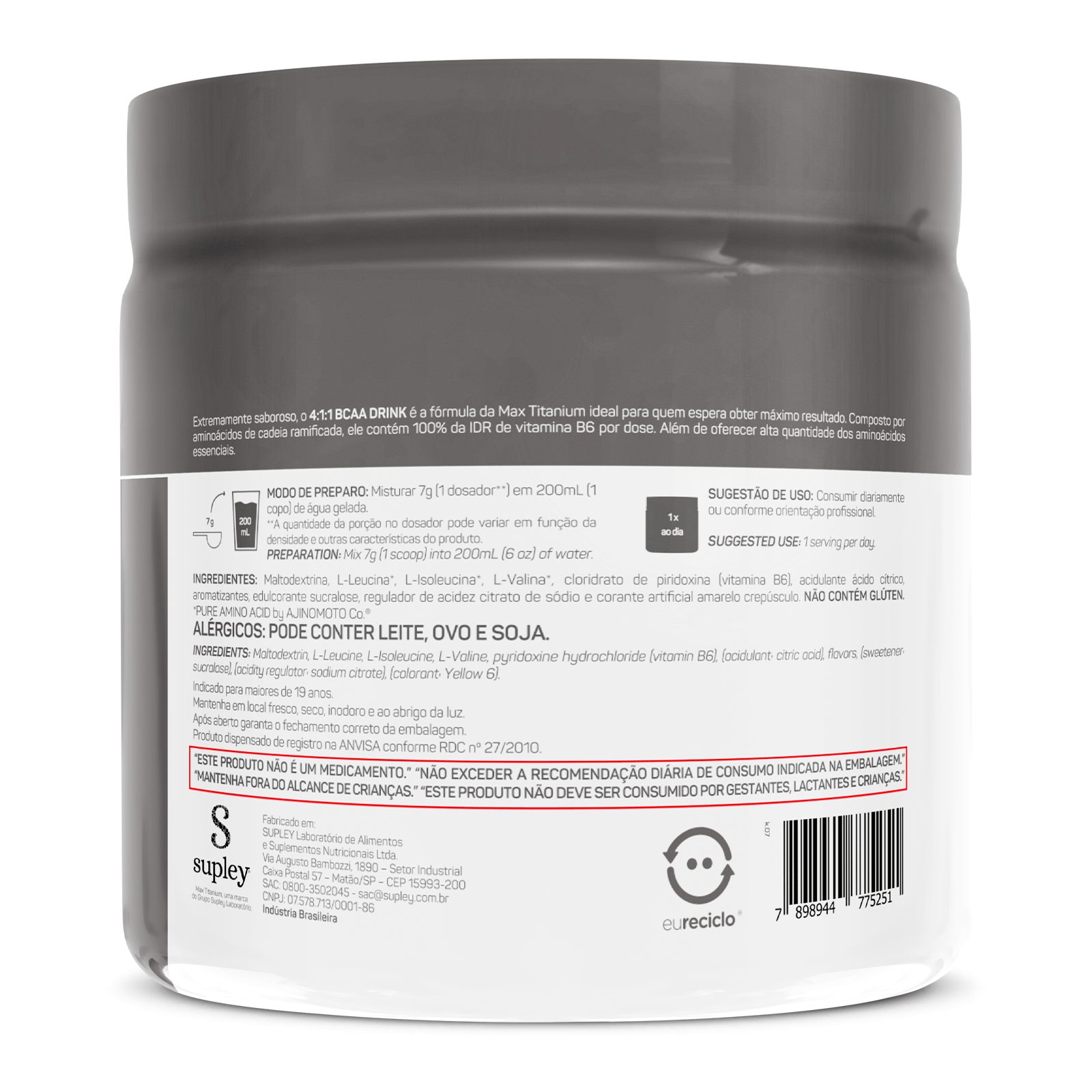 Extremamente saboroso e disponível em quatro versões, o 4:1:1 BCAA DRINK é a fórmula da Max Titanium ideal para quem espera obter máximo resultado. Composto por aminoácidos de cadeia ramificada, ele contém 100% da IDR de vitamina B6 por dose. Além de oferecer alta quantidade dos aminoácidos essenciais.