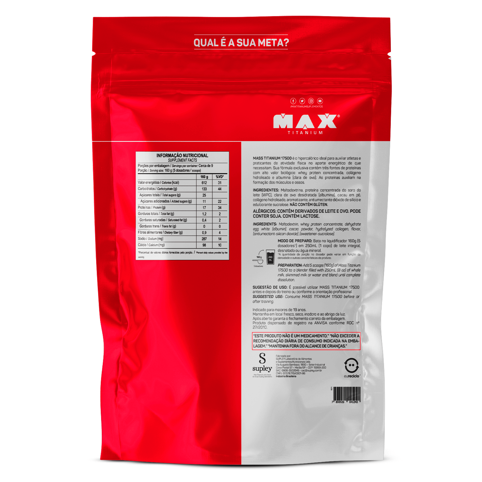 MASS TITANIUM 17500 é o hipercalórico ideal para auxiliar atletas e praticantes de atividade física no aporte energético de que necessitam. Sua fórmula exclusiva contém três fontes de proteínas com alto valor biológico: whey protein concentrada, colágeno hidrolisado e albumina (clara de ovo). As proteínas auxiliam na formação dos músculos.