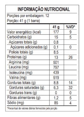 É fonte de proteínas, conta com aporte de carboidratos de baixo índice glicêmico, TCM e possui apenas os açúcares naturalmente presentes em seus ingredientes.