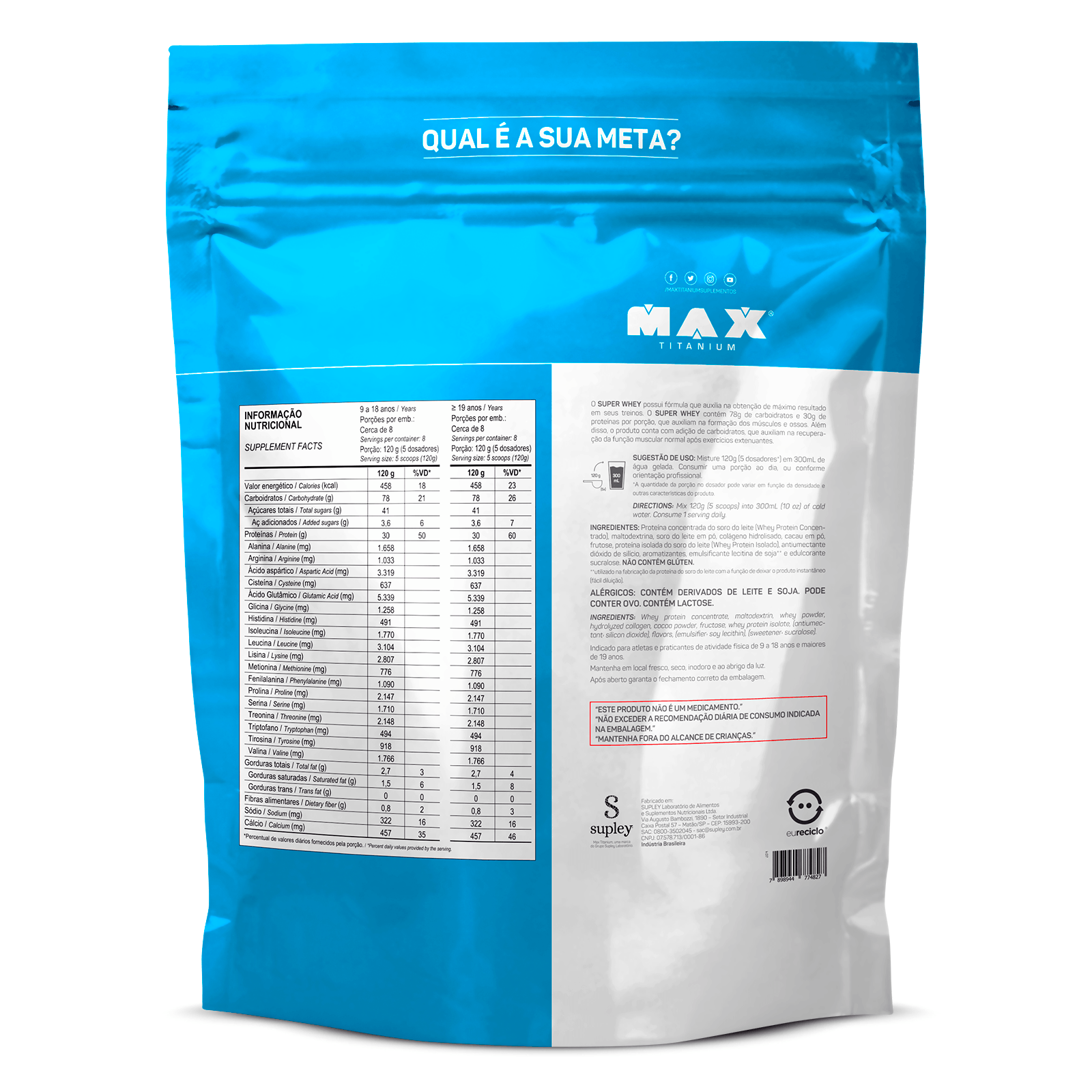 O SUPER WHEY contém 79g de carboidratos e 30g de proteínas por porção, que auxiliam na formação dos músculos e ossos.
