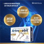Artromobil HA é a marca de suplemento alimentar completa na composição: Colágeno tipo II não hidrolisado responsável pelo bloqueio da degradação articular mais ação anti-inflamatório. Ácido hialurônico – melhora a viscosidade e elasticidade. / Vitamina D3: importante para o fortalecimento ósseo e imunorregulação da inflamação. MSM: Antioxidante