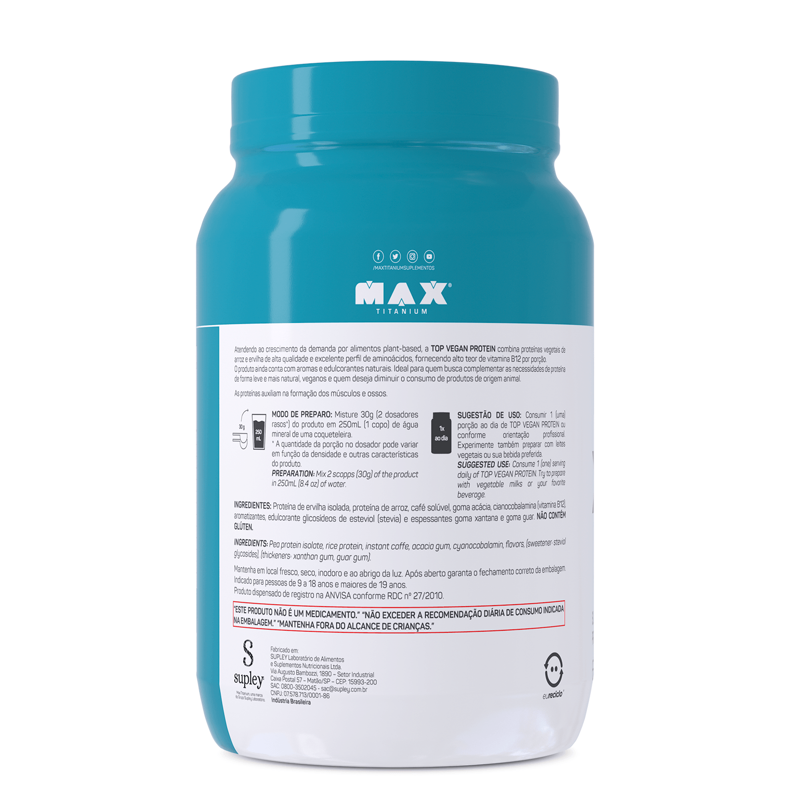 TOP VEGAN PROTEIN � uma formula��o exclusiva que combina prote�nas vegetais de arroz e ervilha de alta qualidade e excelente perfil de amino�cidos, fornecendo 100% da necessidade di�ria da vitamina B12. TOP VEGAN PROTEIN conta ainda com aromas e edulcorantes naturais e Fibregum" - fibra prebi�tica sol�vel de origem vegetal e possui f�cil dissolu��o. TOP VEGAN PROTEIN � um produto ideal para vegetarianos e veganos, com o objetivo de complementar as necessidades de prote�na de forma saud�vel e natural.