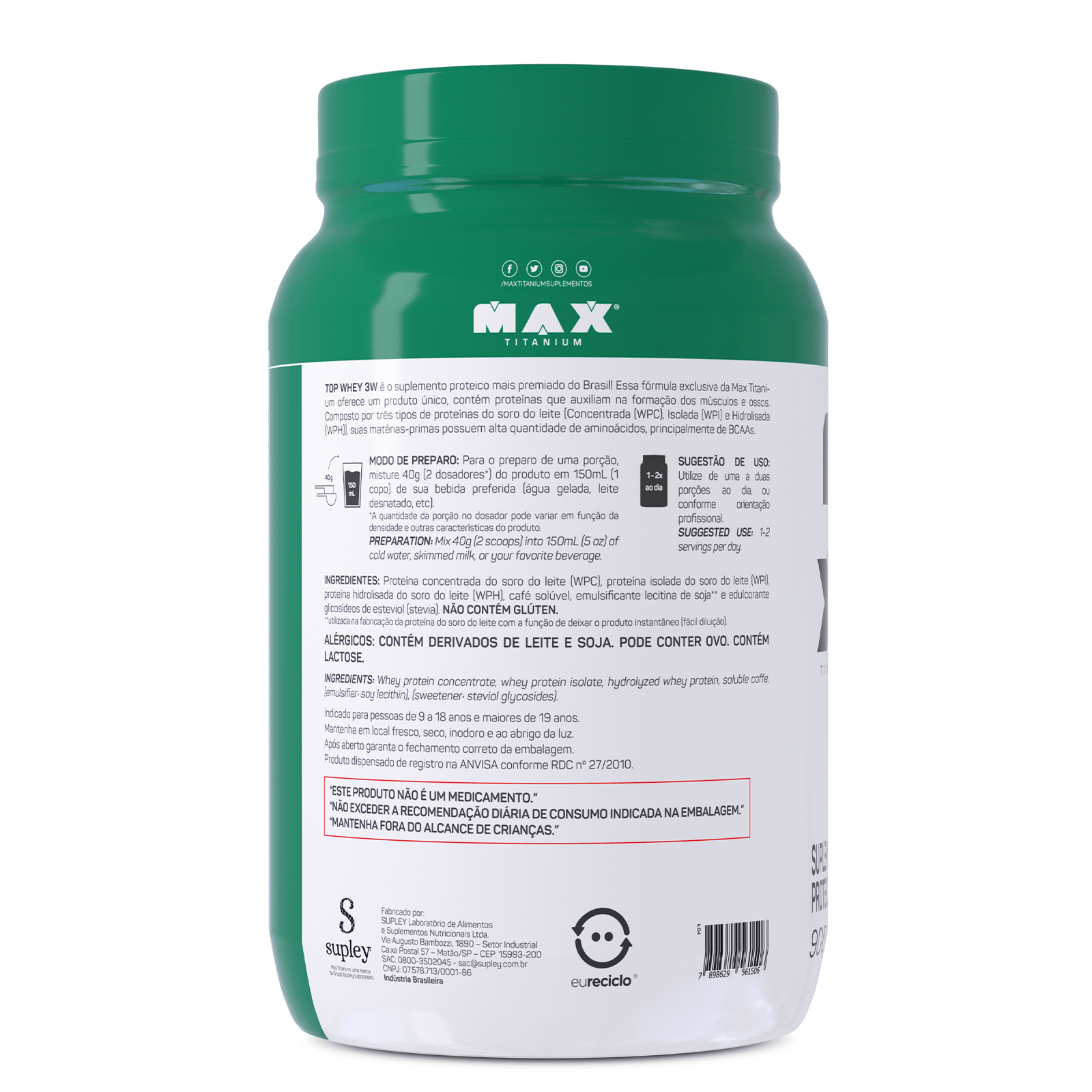 TOP WHEY 3W contém três tipos de proteínas do soro do leite: concentrada (WPC), isolada (WPI) e hidrolisada (WPH), matérias-primas com alta concentração de aminoácidos, principalmente de BCAAs. Essa fórmula exclusiva da Max Titanium oferece um produto único, que auxilia na formação dos músculos e na recuperação muscular pós-treino. A linha Mais Natural fornece 26g de proteínas por porção, contendo altas quantidades de aminoácidos essenciais e com aromas, corantes e edulcorantes naturais (estévia e taumatina). Além disso, o Top Whey 3W é o suplemento proteico mais premiado do Brasil!