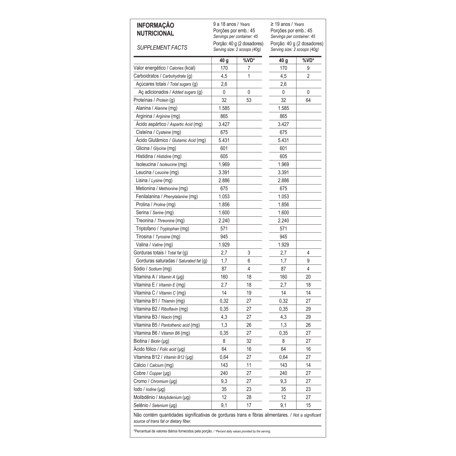Composto por três tipos de proteínas do soro do leite (Concentrada (WPC), Isolada (WPI) e Hidrolisada (WPH), suas matérias-primas possuem alta quantidade de aminoácidos, principalmente de BCAAs.