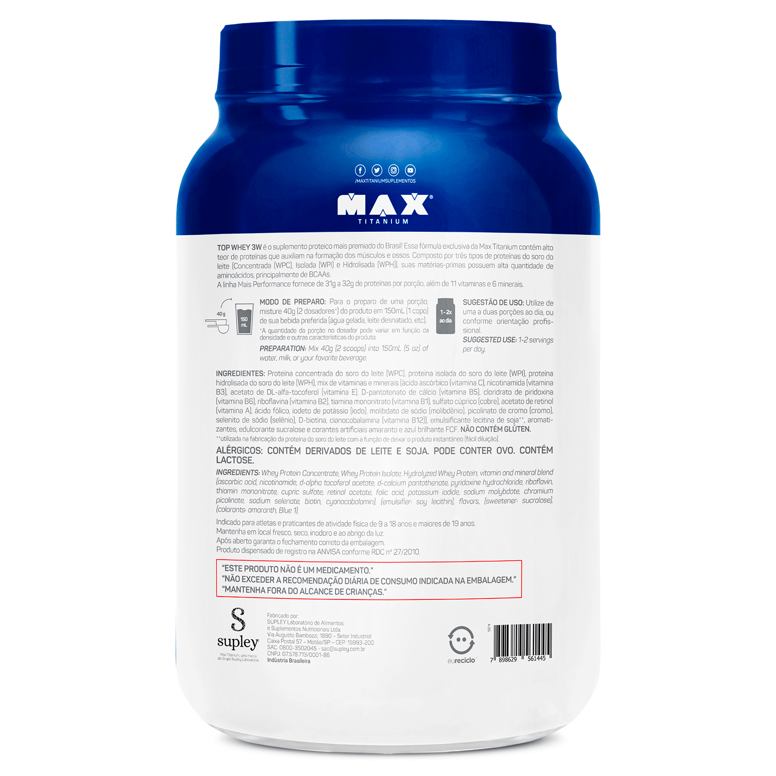TOP WHEY 3W é o suplemento proteico mais premiado do Brasil! Essa fórmula exclusiva da Max Titanium contém alto teor de proteínas que auxiliam na formação dos músculos. Composto por três tipos de proteínas do soro do leite (Concentrada (WPC), Isolada (WPI) e Hidrolisada (WPH), suas matérias-primas possuem alta quantidade de aminoácidos, principalmente de BCAAs. A linha Mais Performance fornece de 31g a 32g de proteínas por porção, além de 11 vitaminas e 6 minerais.