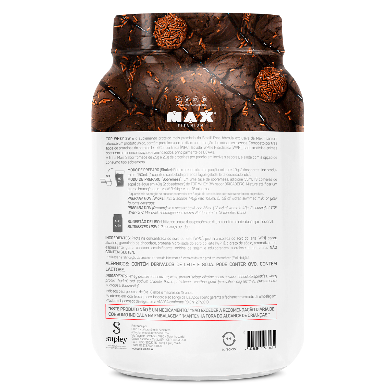 TOP WHEY 3W é o suplemento proteico mais premiado do Brasil! Essa fórmula exclusiva da Max Titanium oferece um produto único, contém proteínas que auxiliam na formação dos músculos. Composto por três tipos de proteínas do soro do leite (concentrada (WPC), isolada (WPI) e hidrolisada (WPH)), suas matérias-primas possuem alta concentração de aminoácidos, principalmente de BCAAs. A linha Mais Sabor fornece de 25g a 26g de proteínas por porção em incríveis sabores, e ainda com a opção de consumo tipo sobremesa!