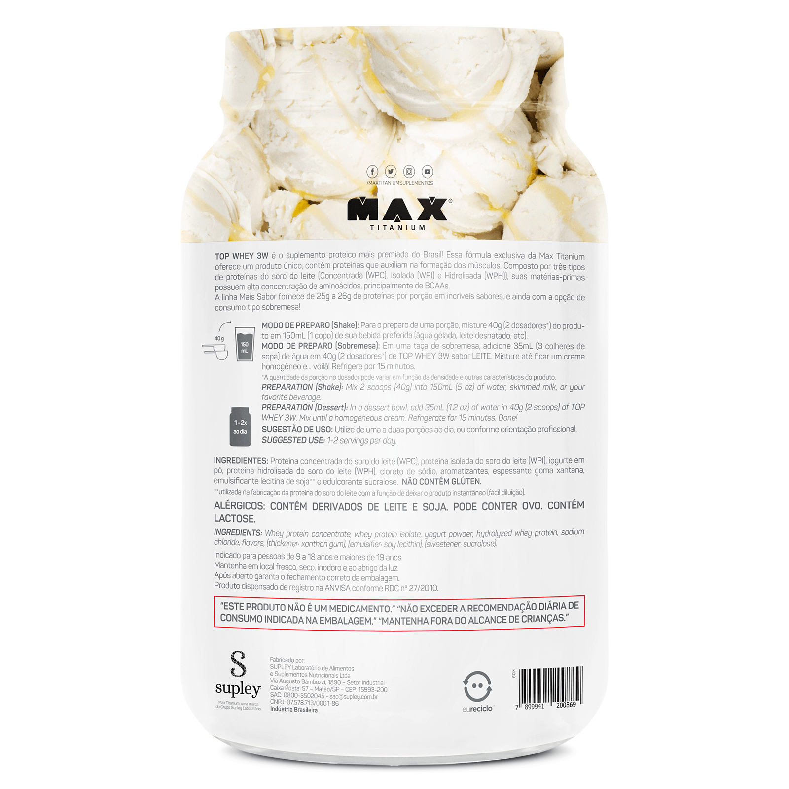 TOP WHEY 3W é o suplemento proteico mais premiado do Brasil! Essa fórmula exclusiva da Max Titanium oferece um produto único, contém proteínas que auxiliam na formação dos músculos. Composto por três tipos de proteínas do soro do leite (concentrada (WPC), isolada (WPI) e hidrolisada (WPH)), suas matérias-primas possuem alta concentração de aminoácidos, principalmente de BCAAs. A linha Mais Sabor fornece de 25g a 26g de proteínas por porção em incríveis sabores, e ainda com a opção de consumo tipo sobremesa!
