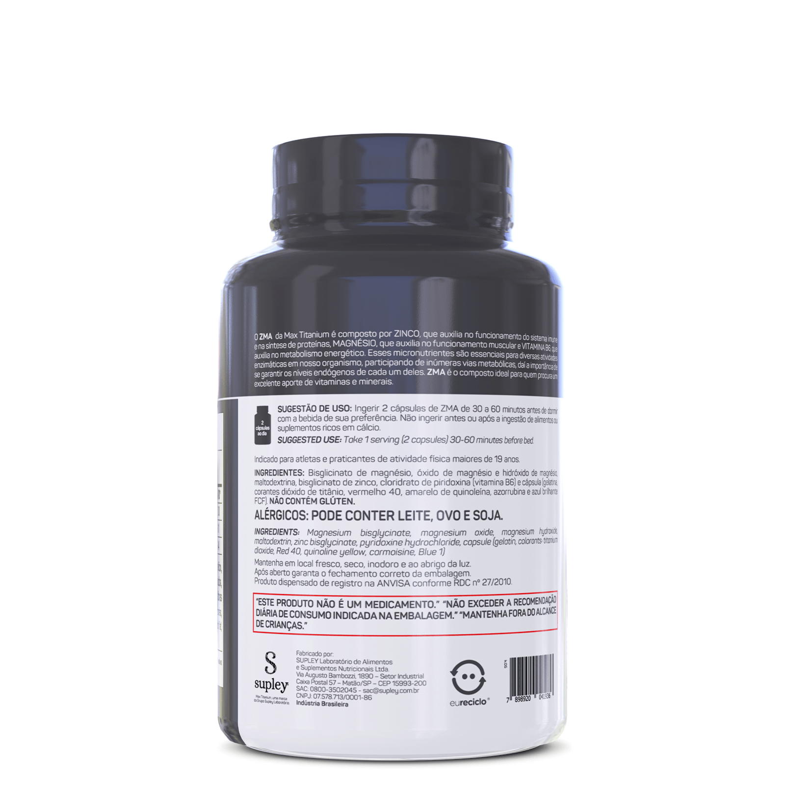 O ZMA da Max Titanium � composto por ZINCO, que auxilia no funcionamento do sistema imune e na s�ntese de prote�nas, MAGN�SIO, que auxilia no funcionamento muscular e VITAMINA B6, que auxilia no metabolismo energ�tico.